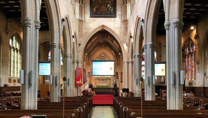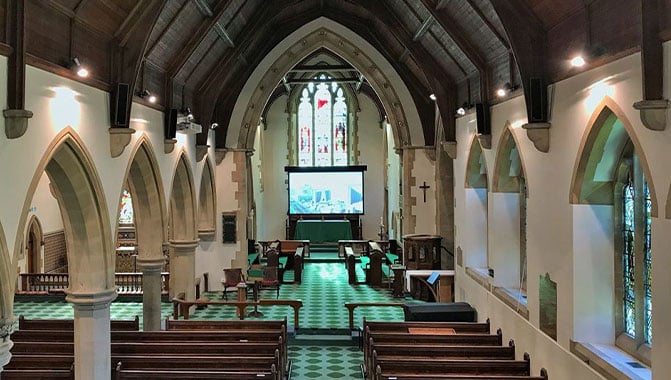 At St James’ Trowbridge, CAVS was tasked with integrating modern AV technology into the traditional parish church which dates back to the 15th century. Three Christie projectors were used to project onto three screens to the left, right and centre of the grade 1 listed building. All screens have been winched to allow them to be hidden behind the building’s arches when not in use. Projector screens are used for displaying hymn lyrics, still images, video, and even live footage from the church to magnify the image for those sat far away. All operating equipment is housed within a bespoke console – utilising old pews to blend into the Church’s décor. An HD motorised camera with recording and streaming capability was also installed to capture services and events and to provide long term system development potential.