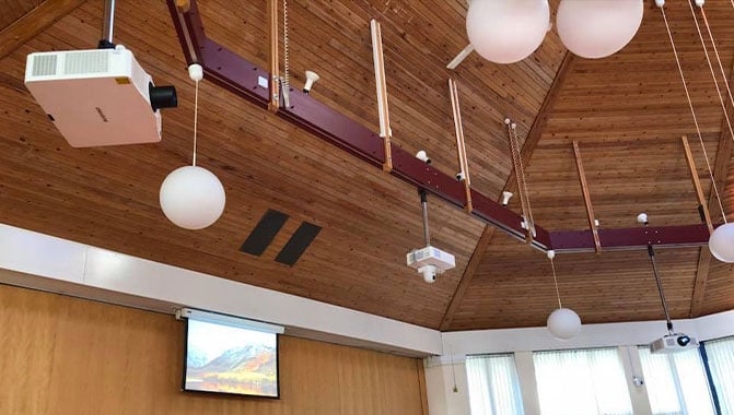 The parish church at Christ Church, Radlett faced many of the dilemmas facing most traditional parish Churches – requiring an effective multi-media system, whilst ensuring the least aesthetic impact on the Church building. CAVS again designed a system which used a motorised winched projection screen (able to be hidden behind the arch when not in use) with a Christie projector and flexible input and output connectivity. This connectivity allows for multiple laptop/device inputs around the building along with multiple HDMI connections for monitors, serving musicians and service leaders. A touch panel at the main console negates the need for multiple remote controls to operate the system – making projector and screen operation straightforward.